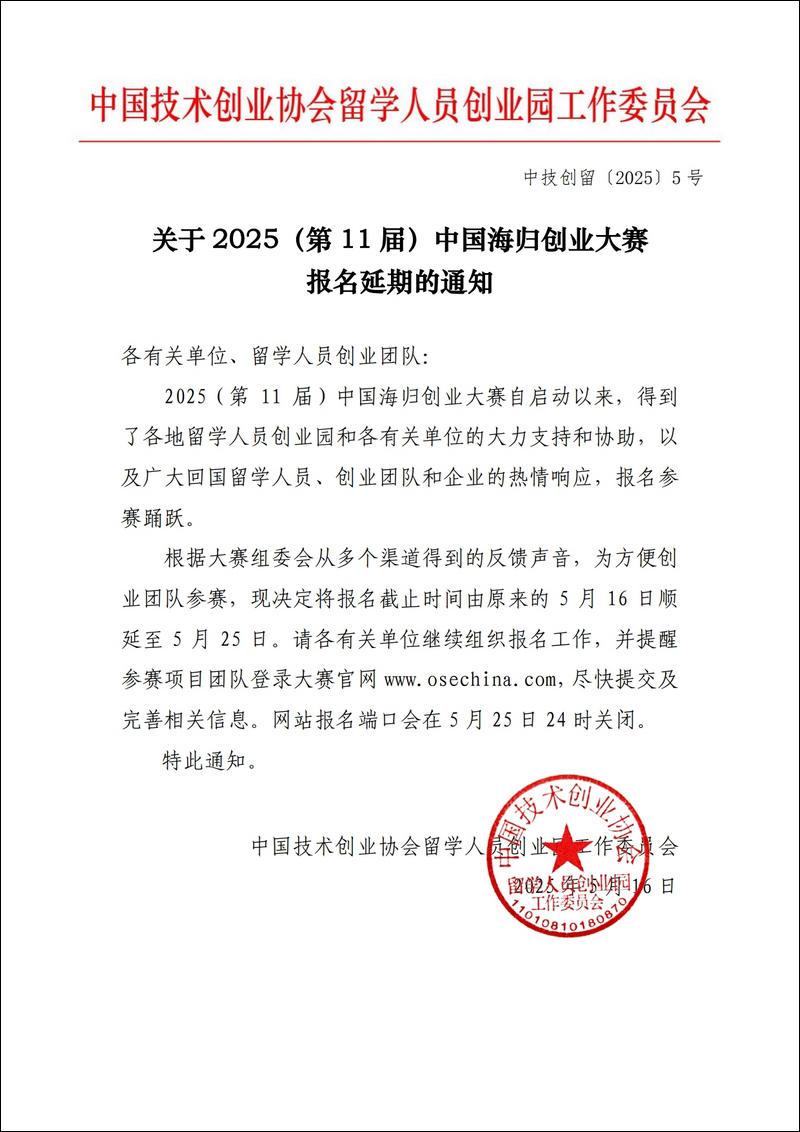 關于2025(第11屆)中國海歸創業大賽報名延期的通知